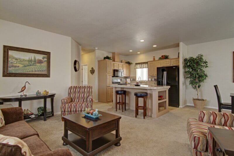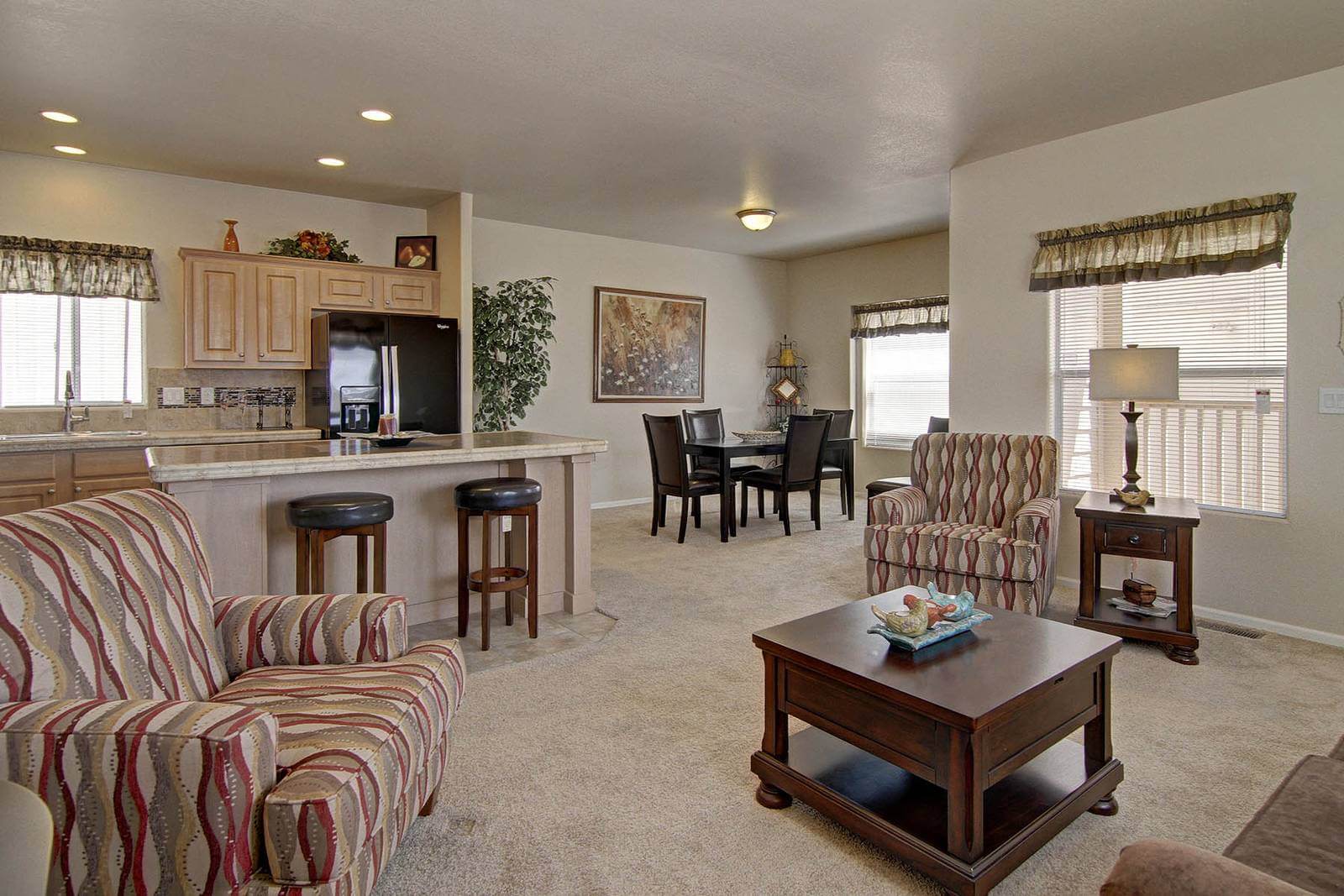 The stylish American Freedom AF2444 double-wide home provides 1027 square feet for small families. At 44′ x 23’4″, it has two bedrooms, two bathrooms, and an open kitchen with ample countertop space. With a modern design and sleek appliances, it offers comfortable, convenient living.