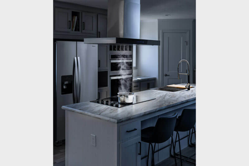 The open-concept kitchen and living room spaces make entertaining a breeze. The kitchen has a full suite of appliances, plenty of cabinet and counter space, and a large center island. The bright, airy living room has a cozy fireplace and sliding glass doors.